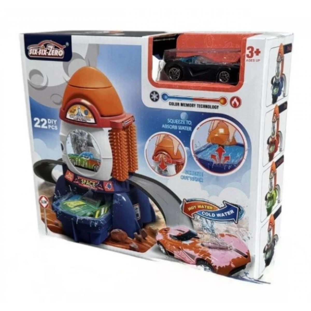 Этот интерактивный настенный или настольный трек от бренда SIX-SIX-ZERO превратит игру с машинками в настоящее научное шоу! Главная особенность набора — использование воды для магического изменения цвета транспорта.
