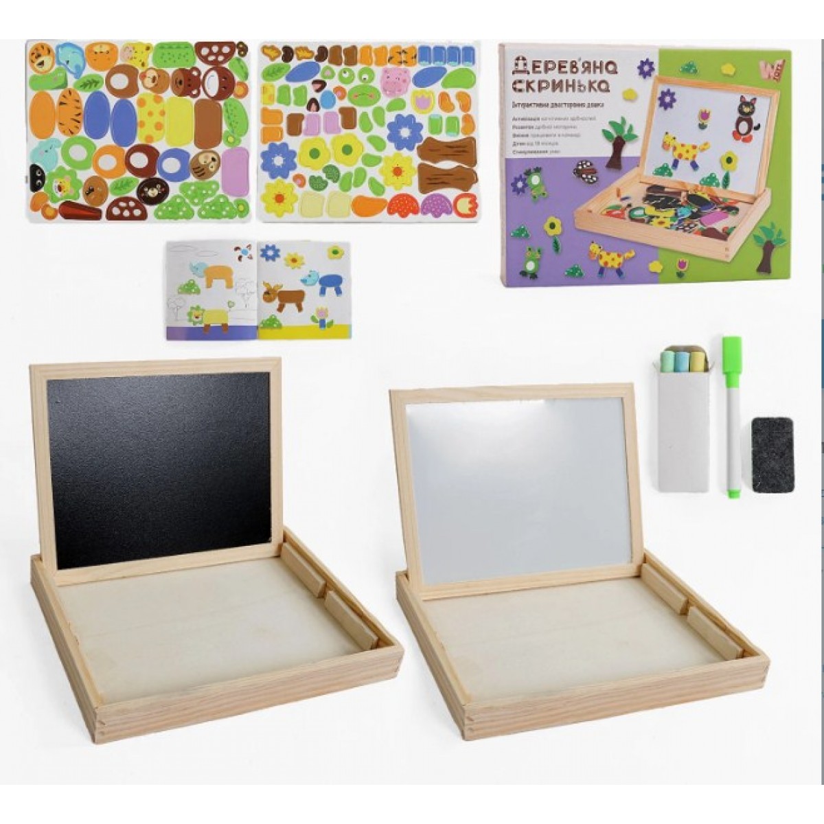 Магнитные элементы создают привлекательную цельную картину, достаточно лишь скомбинировать их. К набору прилагаются мел, маркер и губка для истирания.
