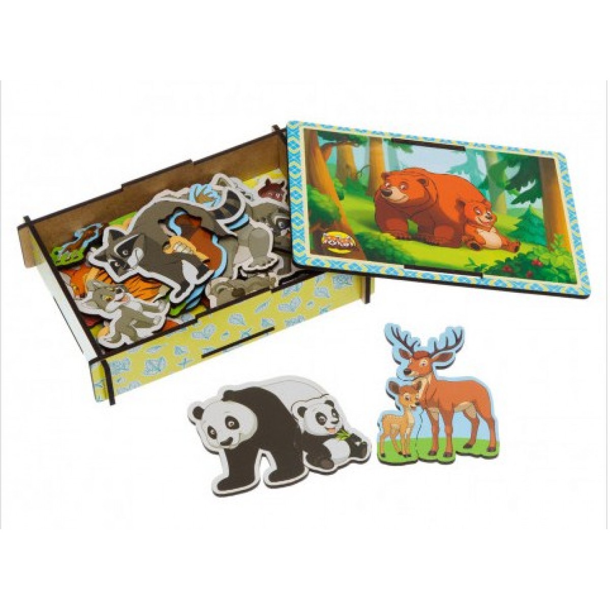 В наборе идут 28 цветных животных. Нужно найти маму со своим малышом. Животные собираются как пазл (малыш в часть мамы). Можно также раскрасить сундук. Такой пазл в сундучке отлично тренирует память, развивает логическое мышление, внимание и мелкую моторику.