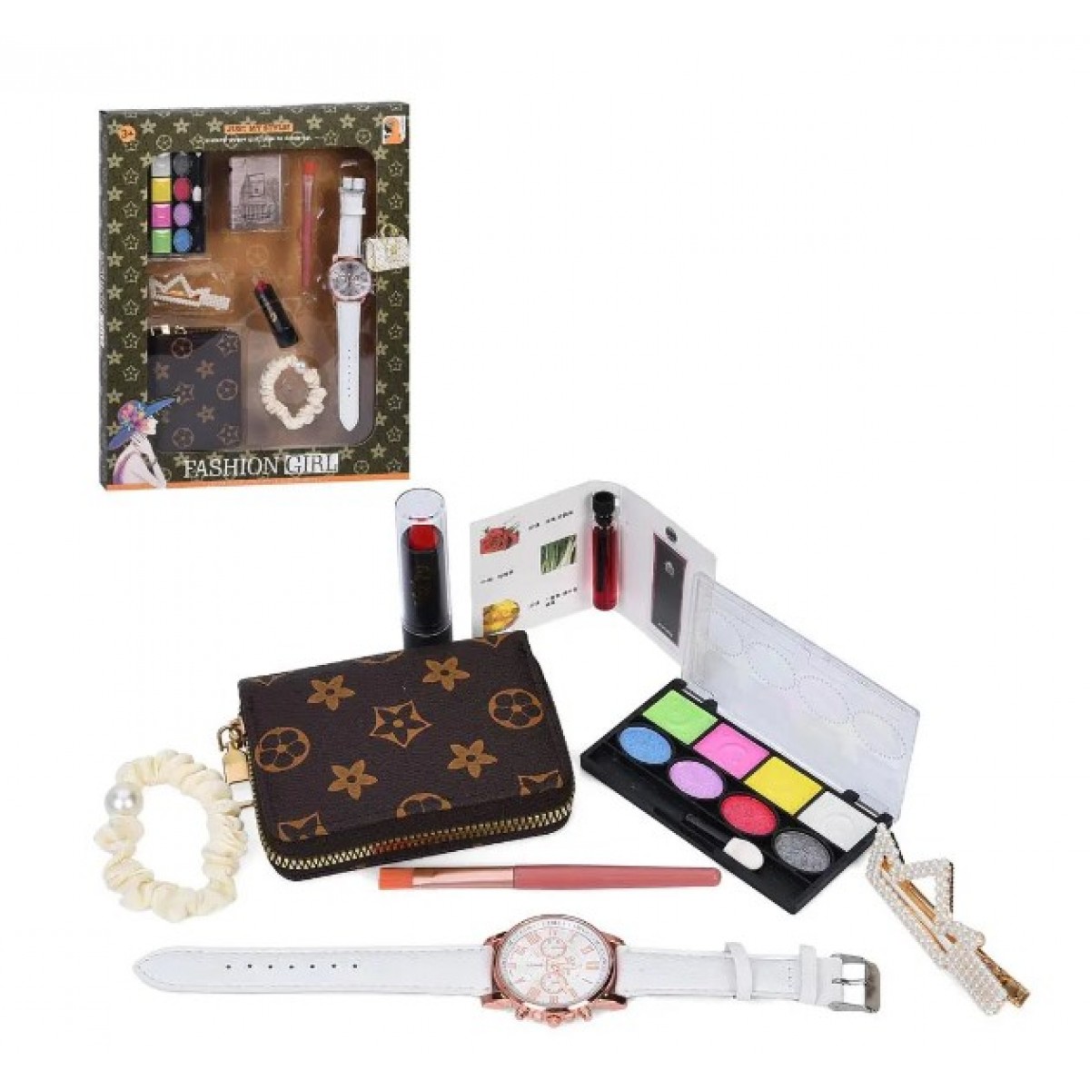 Игровой набор K1 включает в себя тени, помаду, часы на батарейках, резинку для волос, заколку и кошелек. Упакован в коробку для удобного хранения и игры.
