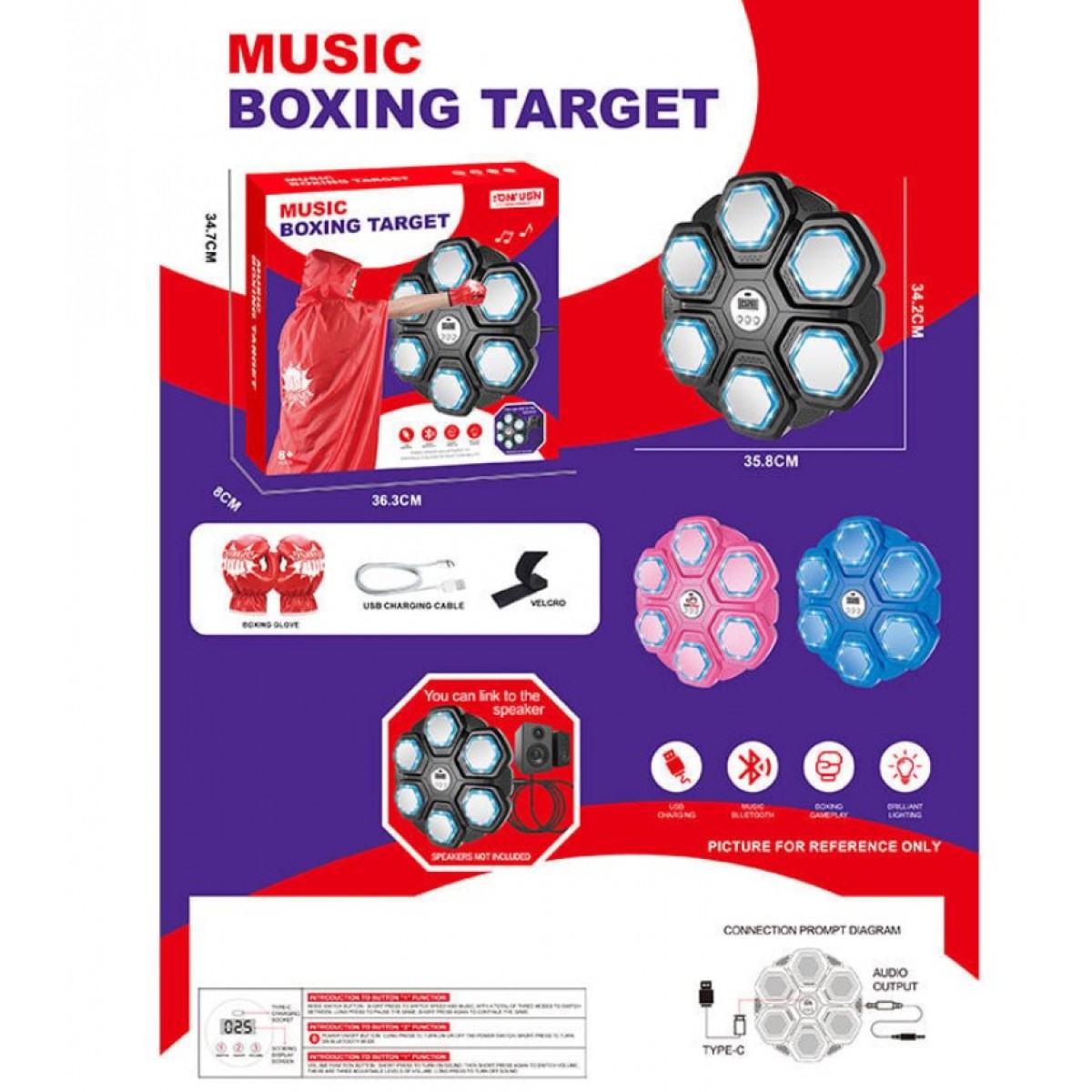 Музыкальный боксерский набор – идеальное развлечение для детей и взрослых, сочетающее игру и физическую активность. Игрушка способствует развитию реакции и координации, обеспечивая при этом море положительных эмоций. Оснащенный световыми эффектами, имеет возможность подключения к вашей колонке или телефону для проигрывания любимых треков, а также содержит встроенные мелодии для еще большей динамики. Питается от встроенного аккумулятора, что гарантирует долгую игру без частой подзарядки. В комплекте предусмотрены боксерские перчатки на липучке и кабель USB для подзарядки и кабель для подключения к колонке.