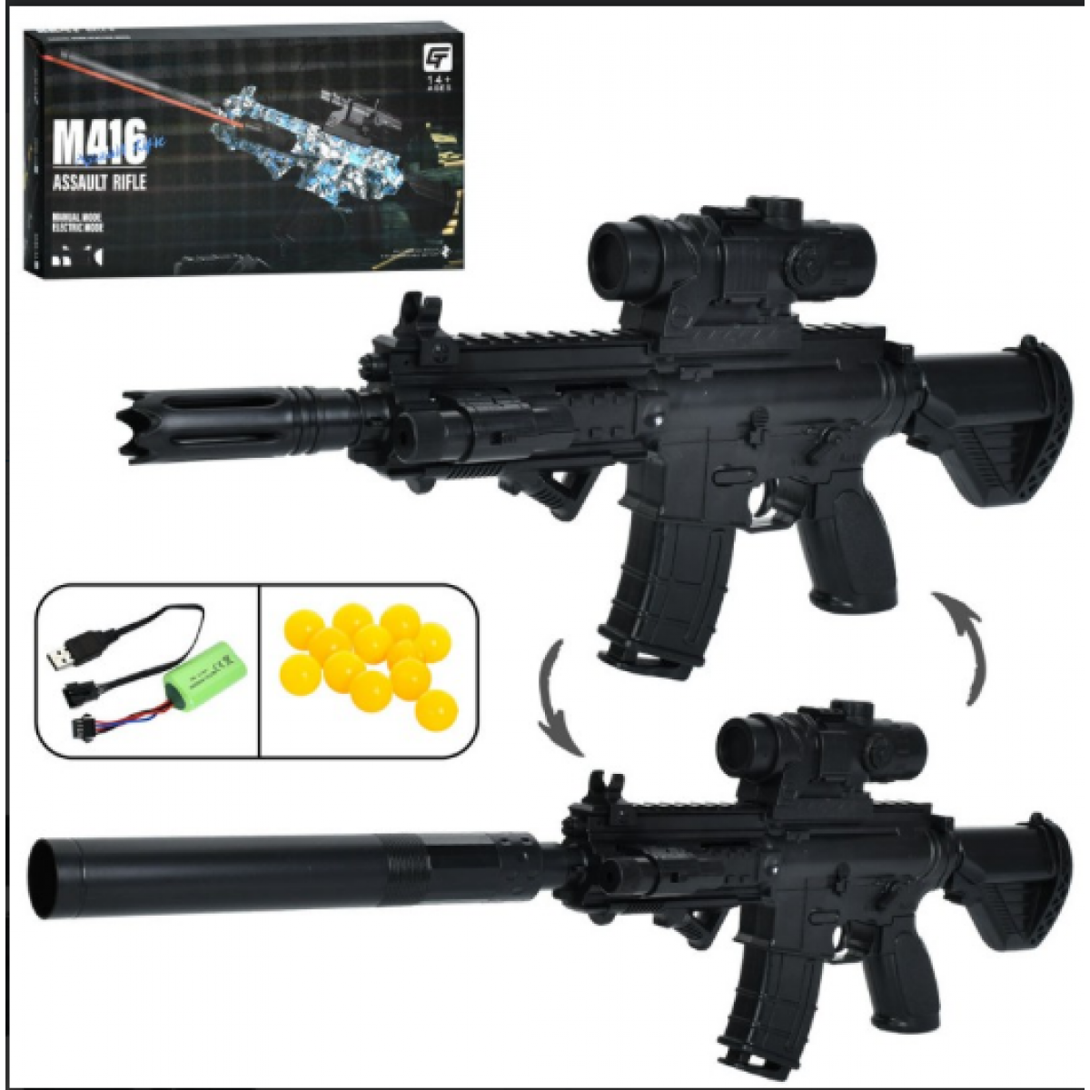 Игрушечный автомат 2031-1A акум., пластиковые шары, лазер, USB, кор., 33,5-19-6 см