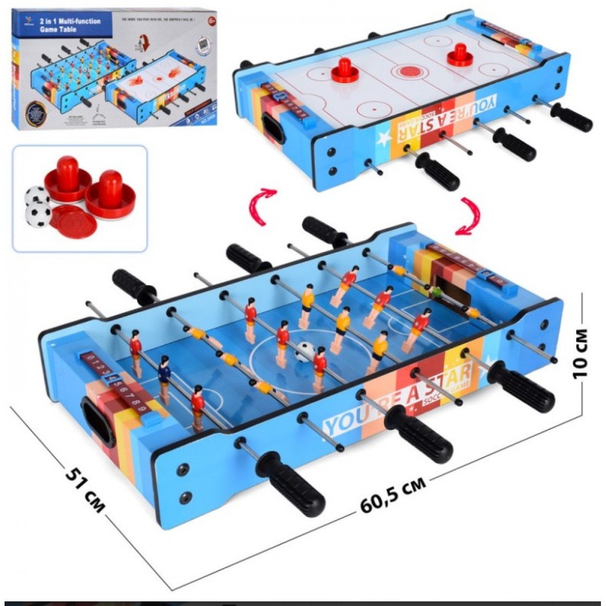 • Футбол 2400 (8шт) дерево, 2в1(на штангах,возд.хоккей),60,5-51-в10см, шкала вед.счета, пакунок малюка
