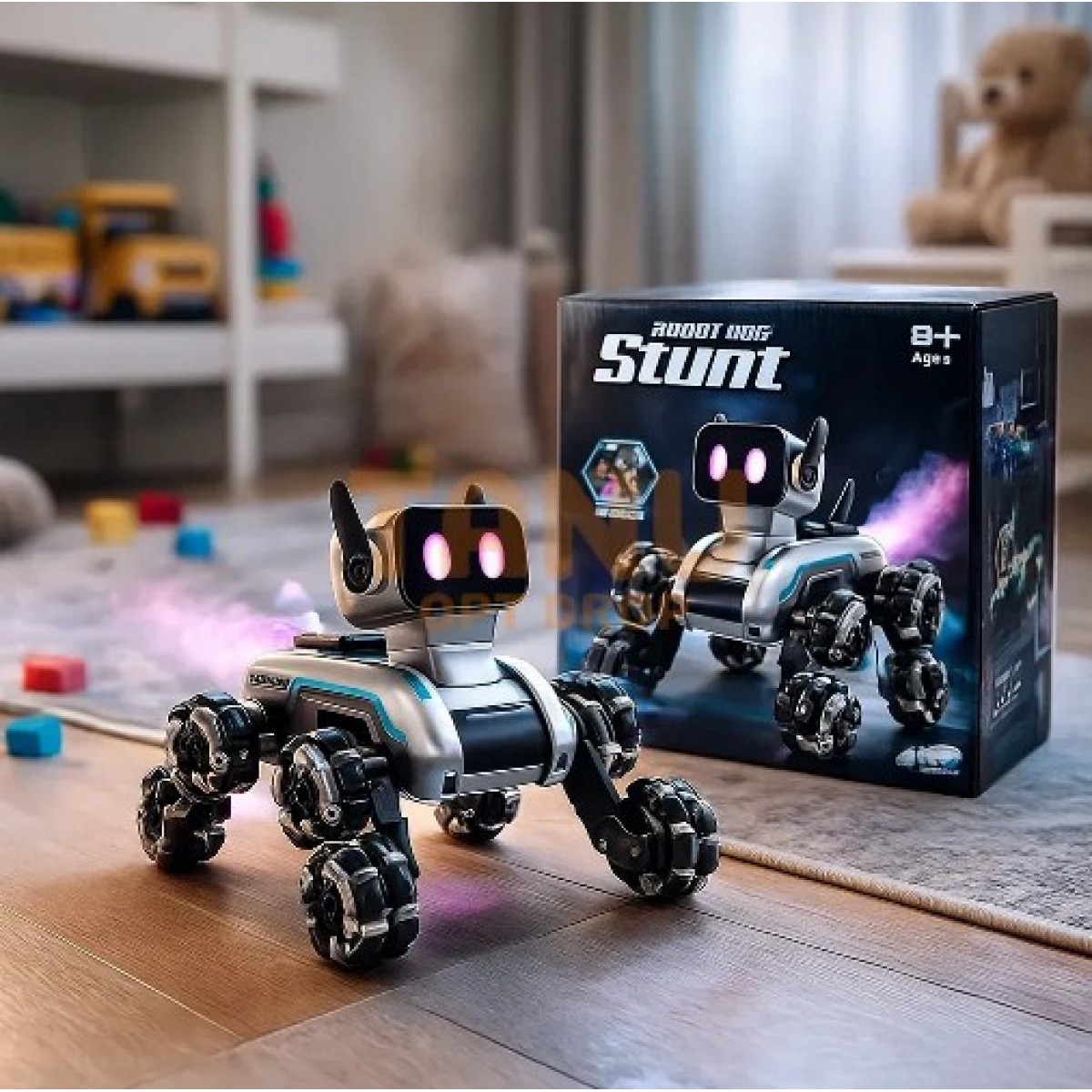 Интерактивный Робот Пес Stunt 8882E предназначен для динамических маневров и выразительной визуализации движения. Конструкция корпуса выполнена в форме футуристического робопса с серебристыми поверхностями и темными вставками, подчеркивающими технологический стиль. Панель с глазами на передней части головы работает в режиме подсветки, создавая разные световые оттенки в зависимости от режима. Шесть маневровых колес с роликовыми сегментами обеспечивают расширенную проходимость по разным направлениям и позволяют выполнять сложные траектории передвижения. В задней части конструкции расположен модуль испускания дымового эффекта, придающий движениям более зрительского характера. Общая геометрия работа оптимизирована для низкого центра тяжести, что повышает устойчивость при быстрых переменах направления и фигурных перемещений.