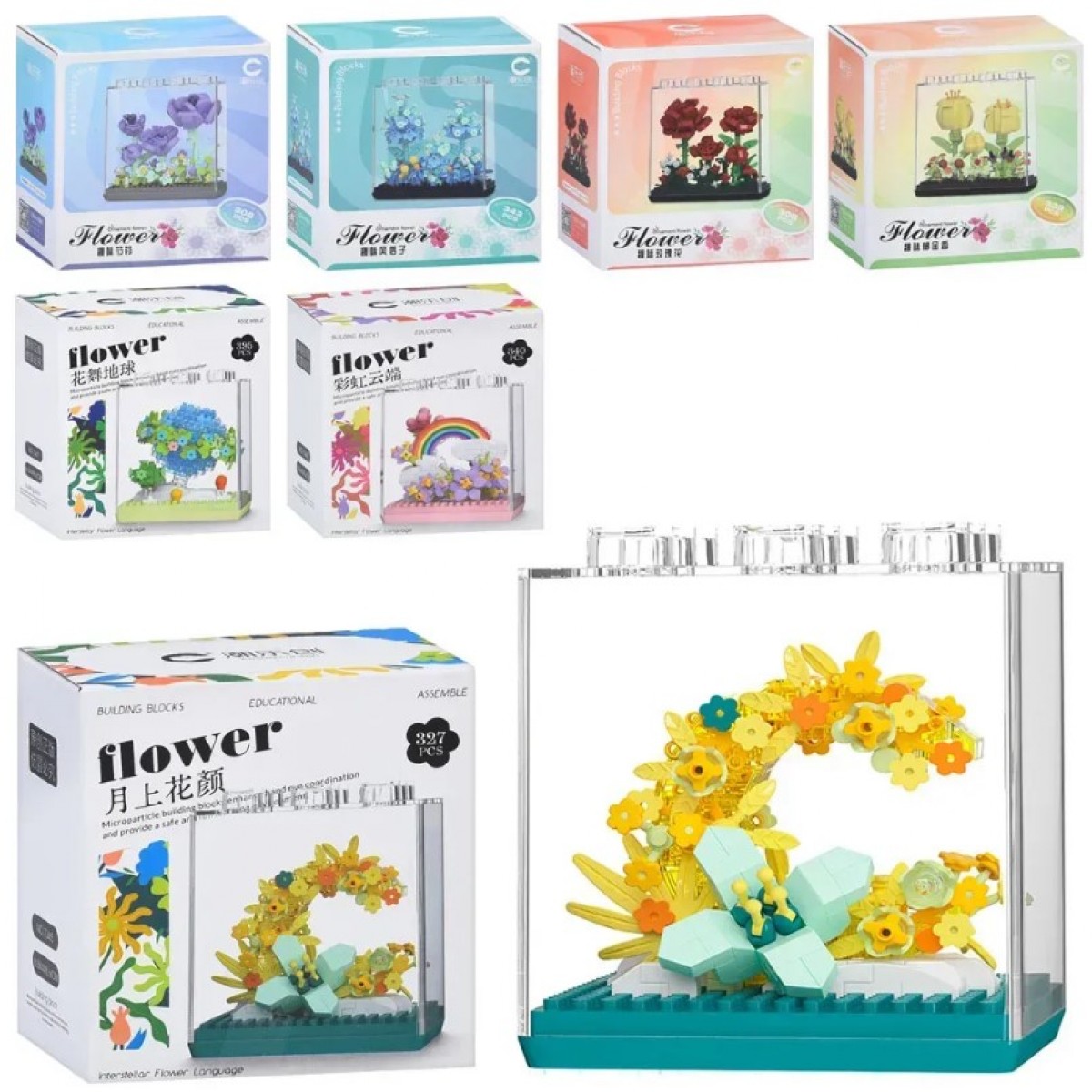 Конструктор 7375-7378/7345-7347цветы в колбе, от 308дет, 7 видов, в кор-ке, 11,5-12,5-7,5см, пакунок малюка