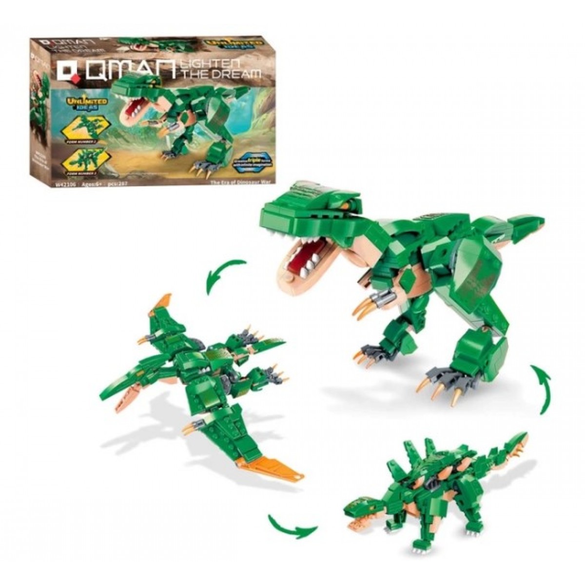 Конструктор Qman W42106 "Unlimited Ideas": 3 в1 Эпоха динозавров – это отличная возможность для детей погрузиться в мир строительства и фантазии. Набор состоит из 287 деталей, позволяющих собрать сразу три разных модели динозавров, что открывает широкое пространство для творчества.