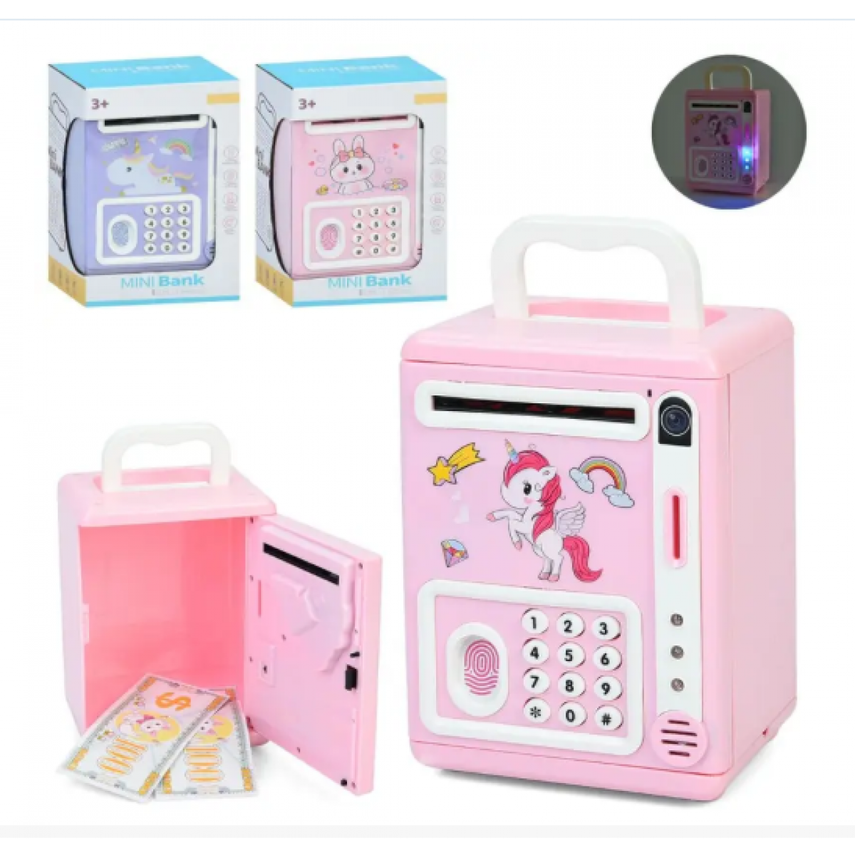 Копилка-сейф MK 5683, сейф с кодом, отпечаток, затягивает купюры, музыка, деньги, 3 вида (зайчик, 2 вида-единорог), на батарейках, в коробке, 14-21-12см