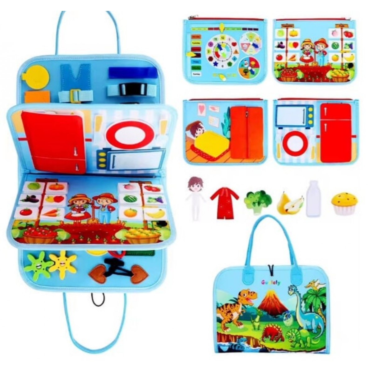 В нем множество активностей для развития мелкой моторики ручек и когнитивных способностей малыша. Элементы на липучках обеспечивают интересную игру с сортировкой и развитие логики и памяти. Страницы легко отделяются от корешка благодаря креплениям-молниям и их можно использовать как отдельные игрушки, а сама книга удобно закрывается на застежку и имеет ручки для переноски.