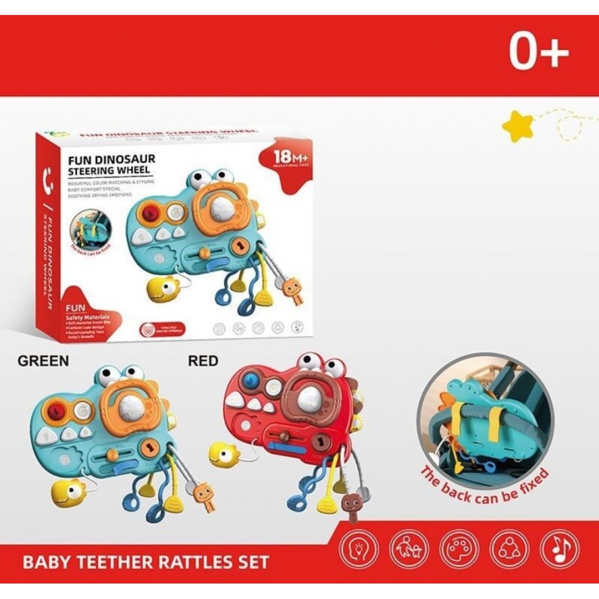 Бизиборд "Умный Динозавр" - яркая многофункциональная игрушка, которая заинтересует малыша с первого взгляда. Веселый дизайн в форме динозавра сочетает полезные сенсорные элементы: пискавку, трещотку, пальчиковые игры и мягкие резиновые прорезыватели. Игрушка способствует развитию моторики, координации и слухового восприятия.