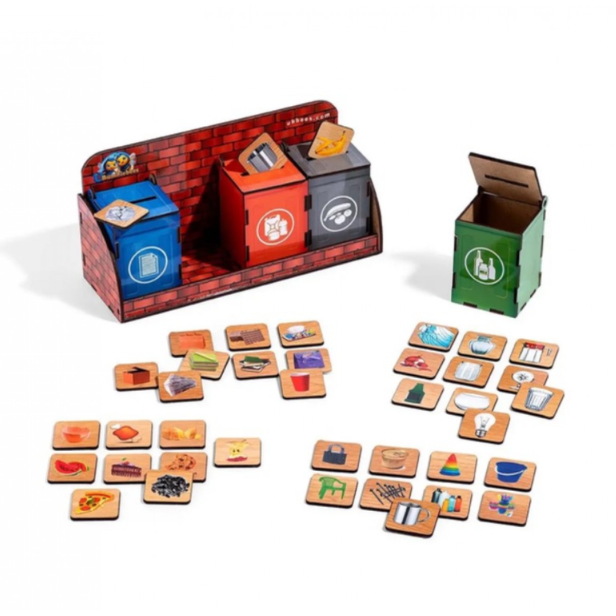 Плашка: 3,5 х 3,5 см. Игра предназначена для ознакомления ребенка с правилами сортировки мусора. В наборе идут 40 плашек с изображением разных бытовых отходов, которые малышу необходимо правильно отсортировать в тематические мусорные баки.