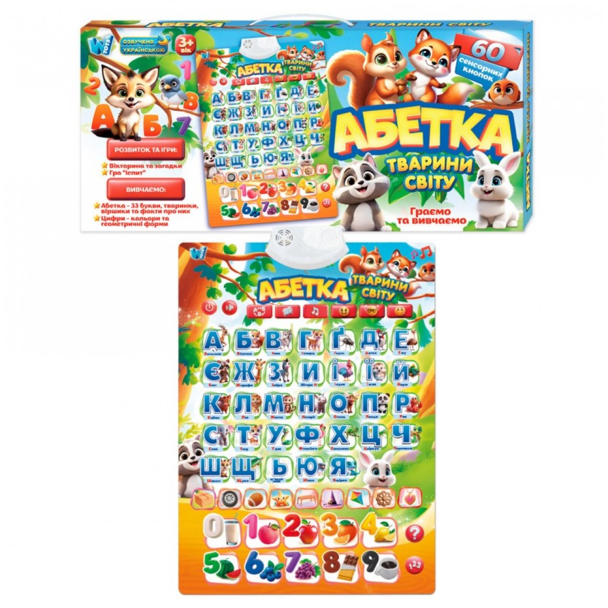 Кроме обучающих функций, плакат содержит веселые детские песни, сказки и стишки, которые делают процесс игры с ним еще более интересным, а режим экзамена позволит проверить свои знания. Удобная панель управления позволяет легко выбирать нужный режим и интуитивно понятна и проста для малышей.