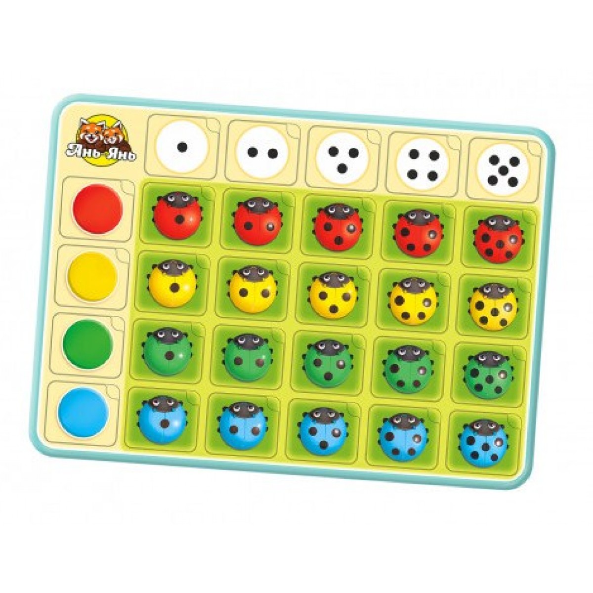 Деревянный планшет-основа на котором размещены: 4 плашки с цветами 5 с точками для счета от 1 до 5, а также 20 плашек с божьими коровками для сортировки. Ребёнку необходимо расположить плашку с божьей коровкой в нужной графе, в указанном цвете и с нужным количеством точек на крылышках.