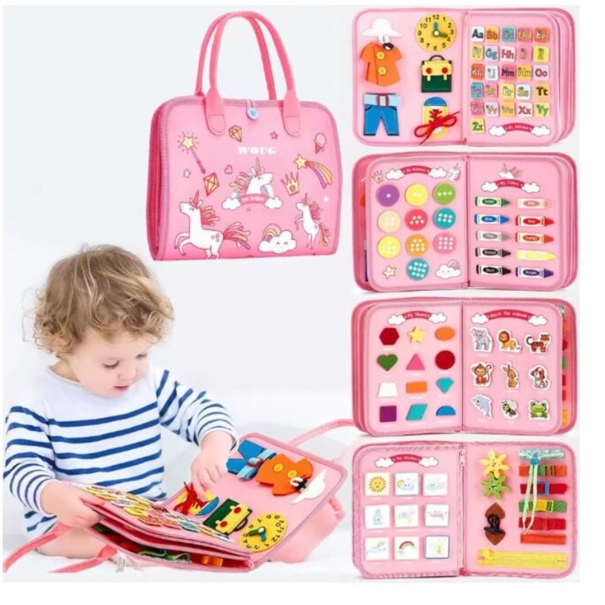 В нем множество активностей для развития мелкой моторики ручек и когнитивных способностей малыша. Элементы на липучках обеспечивают интересную игру с сортировкой и развитие логики и памяти. Страницы легко отделяются от корешка благодаря креплениям-молниям и их можно использовать как отдельные игрушки, а сама книга удобно закрывается на застежку и имеет ручки для переноски.