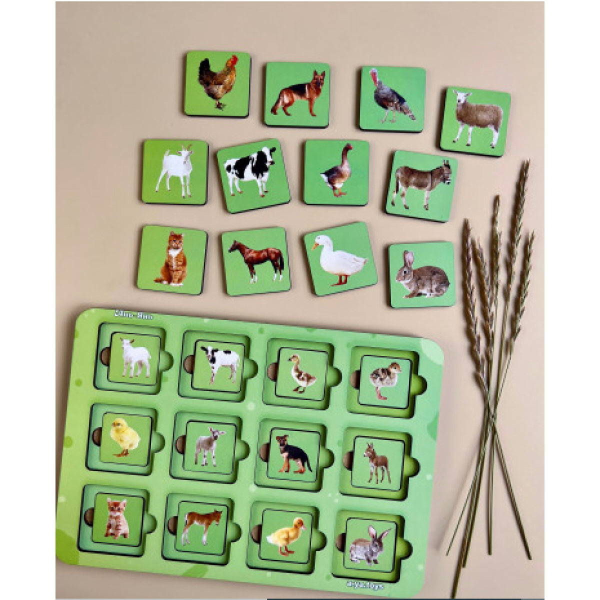 В наборе 24 плашки для игры. Она поможет наглядно показать, как реалистично выглядят взрослые животные и их малыши. Расскажите ребенку, например, как называют детеныша собаки, которая любит есть, что такое будка? Поиграйте в мемори: разложите несколько плашек, посмотрите с изображенным ребенком. Затем переверните плашки и попросите ребенка найти это животное среди остальных плашек.