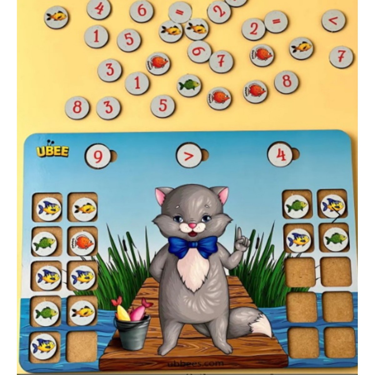 Развивающая игра "Ученый котик" - это ученый котик, который собрался на рыбалку и хочет вместе с рыбками познакомить вашего ребенка с цифрами от 1 до 9 и помочь научиться считать. Также ребенок научится сравнивать рыбок по количеству и различать знаки равенства: "=" и больше ">" и меньше