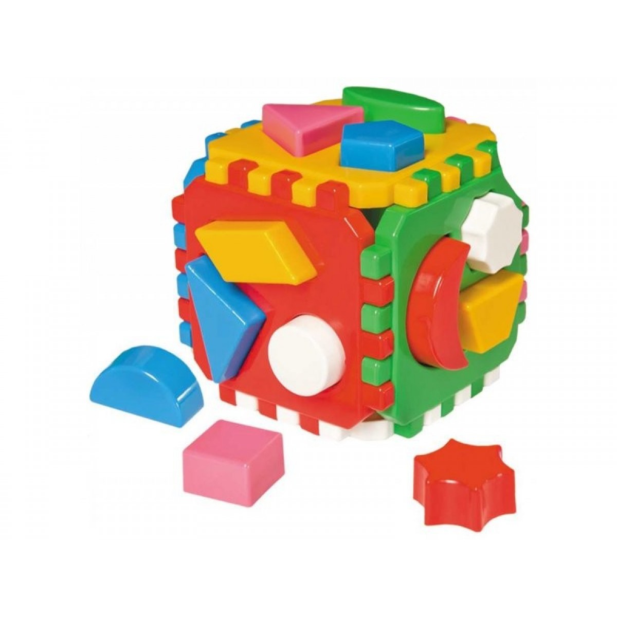 Логический куб 0458 состоит из 6-ти разноцветных граней, на каждой из которых находится отверстие в форме геометрических фигур.