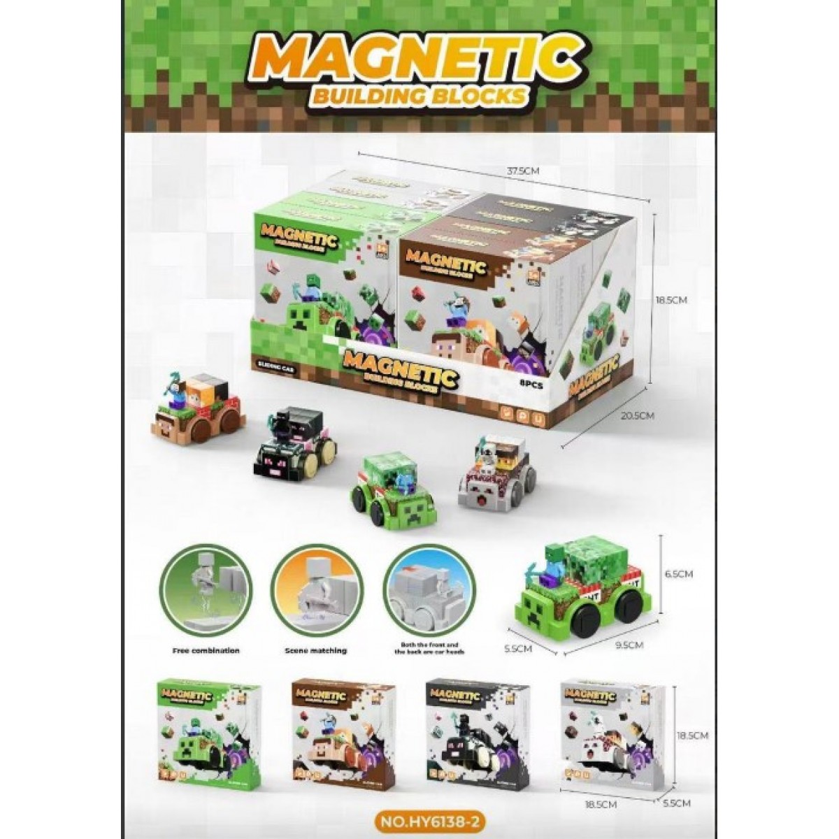 Этот игровой набор совмещает в себе популярную эстетику "пиксельного мира" с функциональностью магнитных конструкторов. Главная особенность серии – создание транспортных средств (машинок) с известными игровыми персонажами.