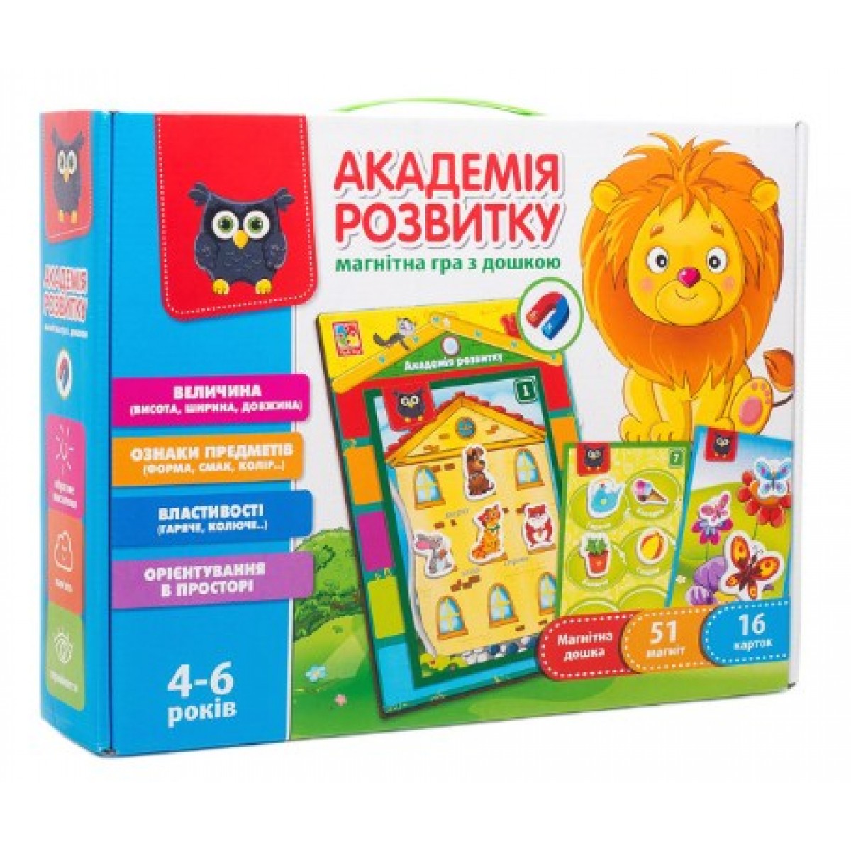 Магнитный набор Vladi Toys Академия развития поможет ребенку с легкостью изучить признаки и свойства предметов, научиться хорошо ориентироваться в пространстве и усвоить базовые знания о величинах.