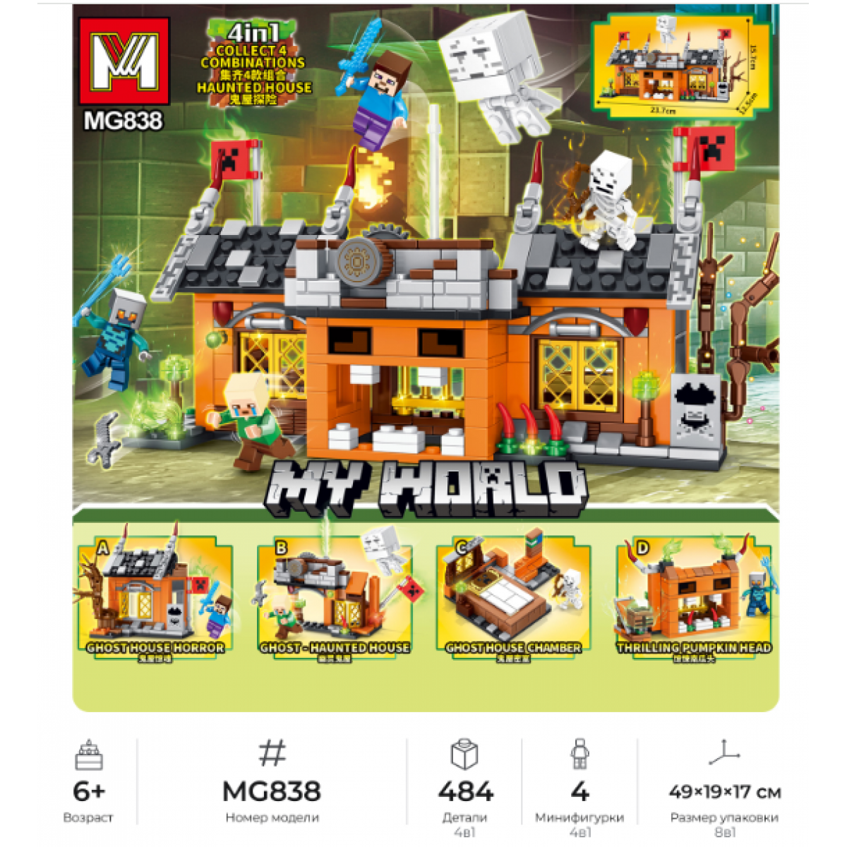 Конструктор Minger My World: Логово гаста 4в1 (MG838) — набор в стиле Minecraft, включающий 4 отдельные сцены, которые можно собирать по отдельности или объединять в одну большую композицию.