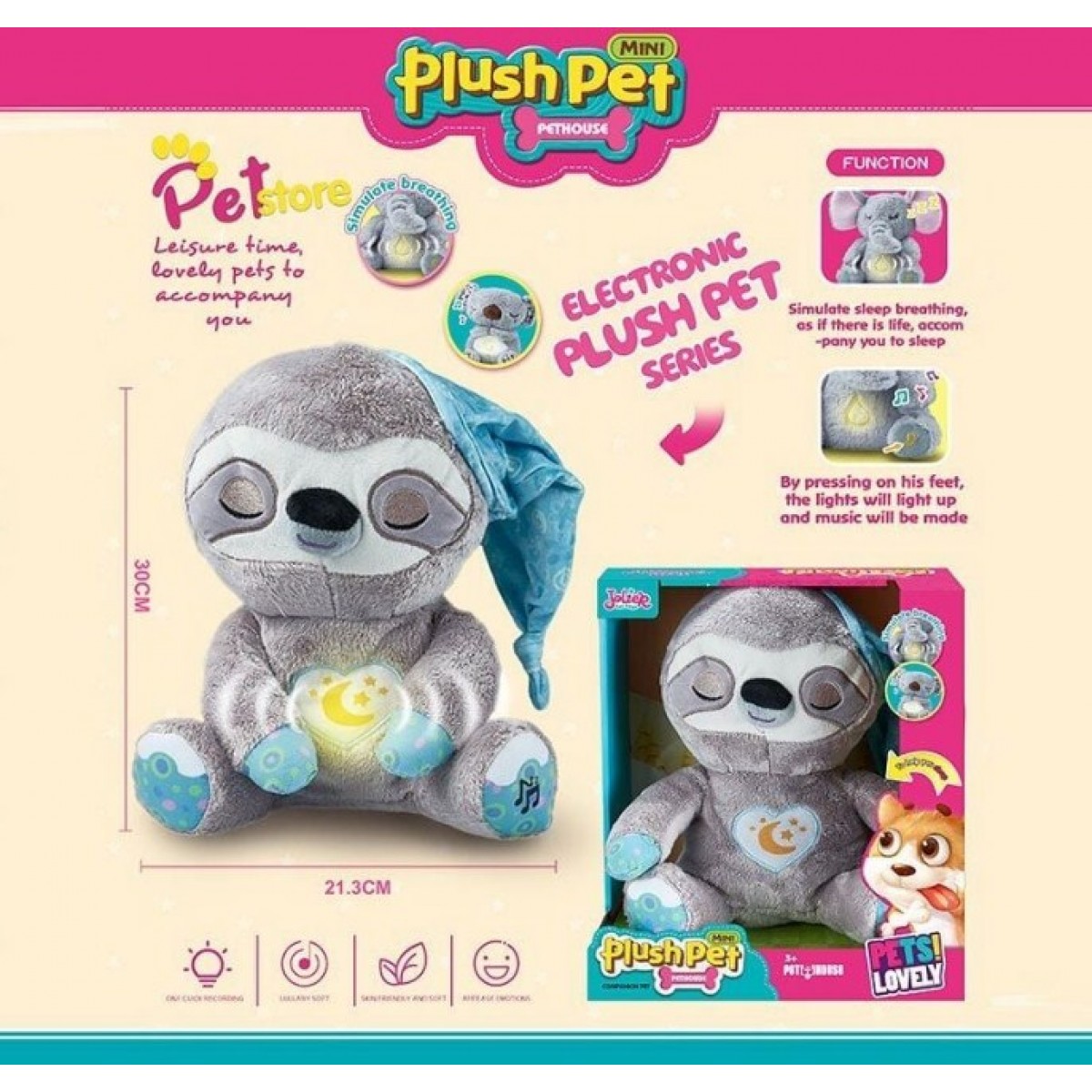 - при нажатии на ножку игрушка начинает дышать, подсвечиваться и воспроизводить успокаивающую музыку;