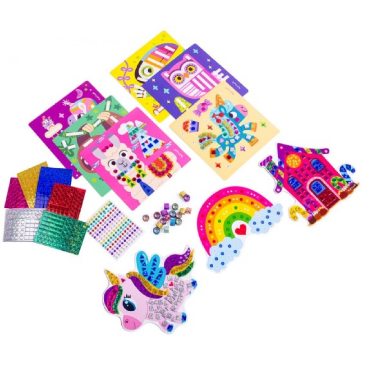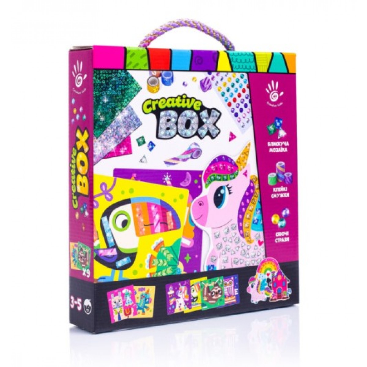 Три разных набора для творчества в одной коробке! Дополняй картинки с изображениями единорога и других персонажей стразами, блестящей мозаикой и сверкающими скотчами. Приклеивай декоративные элементы в подходящие места на рисунке. Картинка сразу приобретет 3D объем и блеск!