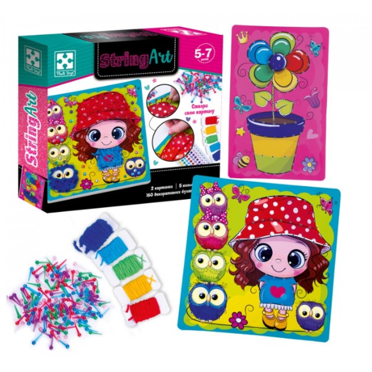 Набор для творчества Vladi Toys Солнечная прогулка позволит ребенку дать волю своей творческой натуре и создать собственный шедевр с помощью цветных нитей, блестящих стразов и булавок в наборе.