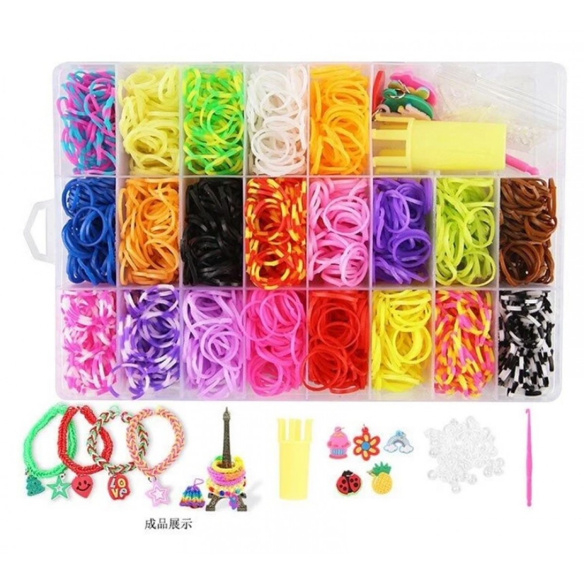 Прозрачный бокс с отделениями поможет удобно хранить все элементы, а разноцветные резиночки вдохновят на создание браслетов, бус и других стильных аксессуаров. В комплекте есть министанок, крючок для плетения, пластиковая фурнитура и подвески, так что ребенок легко сможет воплотить собственные идеи.