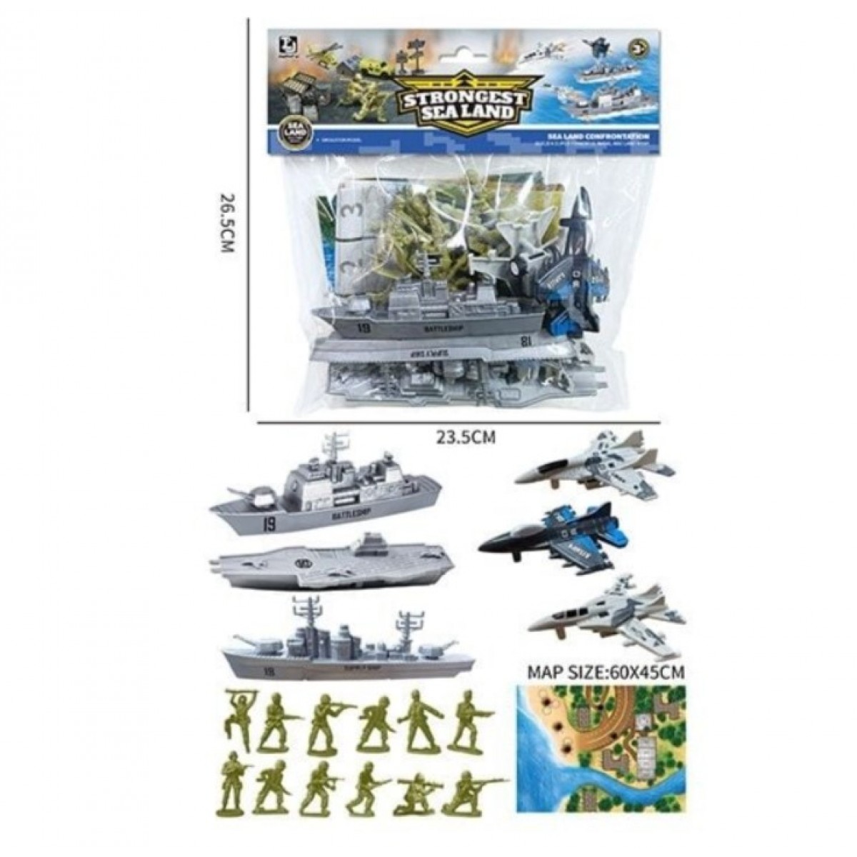 Возьмите игрушки в руки и играйте в реалистичную захватывающую игру! В игровой набор вошли фигурки солдат, истребителей, кораблей и яркое поле для игры. Каждая игрушка имеет детальный дизайн, поэтому игрушечные солдатики напоминают настоящих бойцов, а пластиковые спецсредства - настоящих. Игра помогает развивать воображение и логическое мышление.