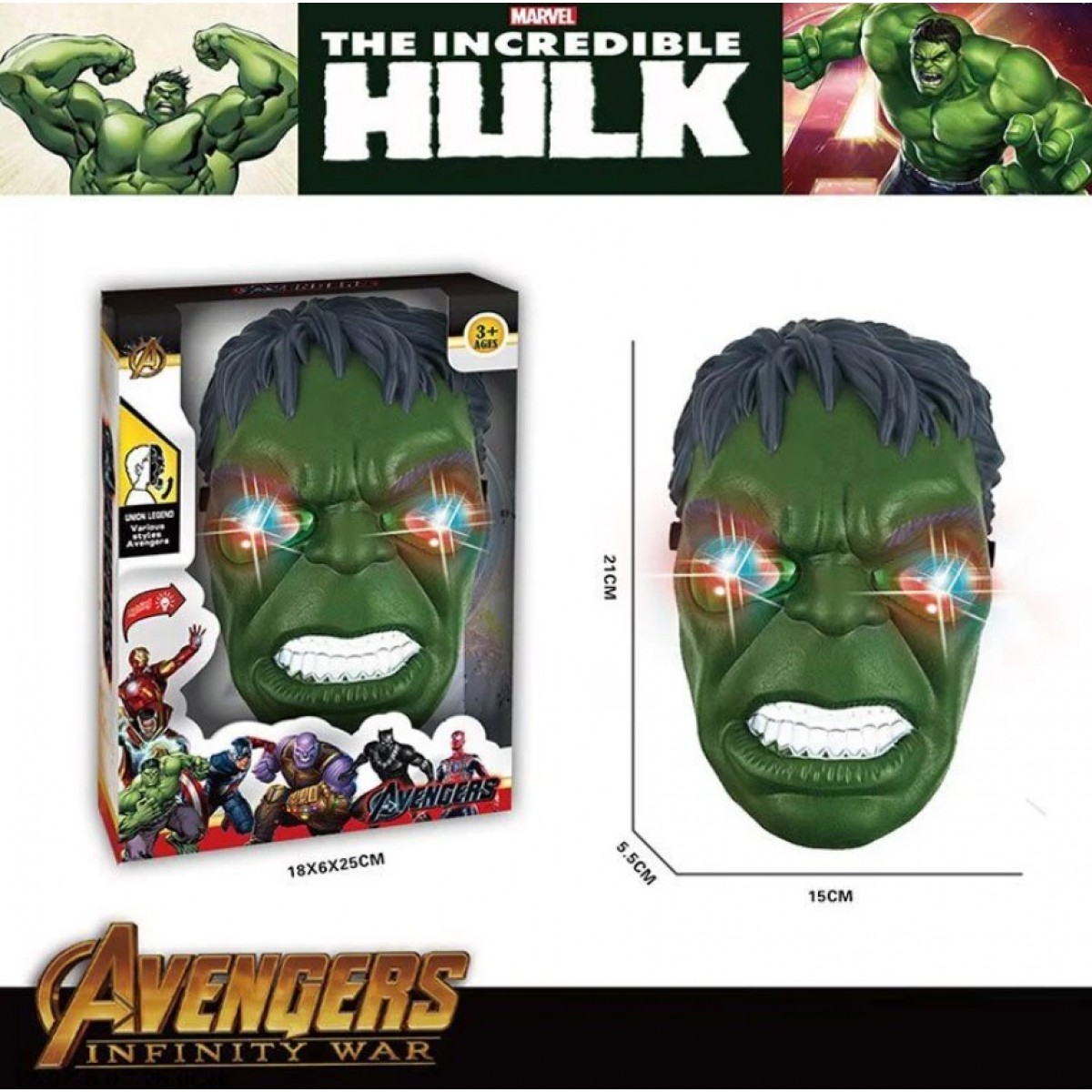 Эта маска героя создана для маленьких фанатов супергеройских приключений! Образ зеленого великана передан очень реалистично: грозное выражение лица, подробно прорисованные черты и яркий эффект подсветки глаз делают маску по-настоящему поразительной.