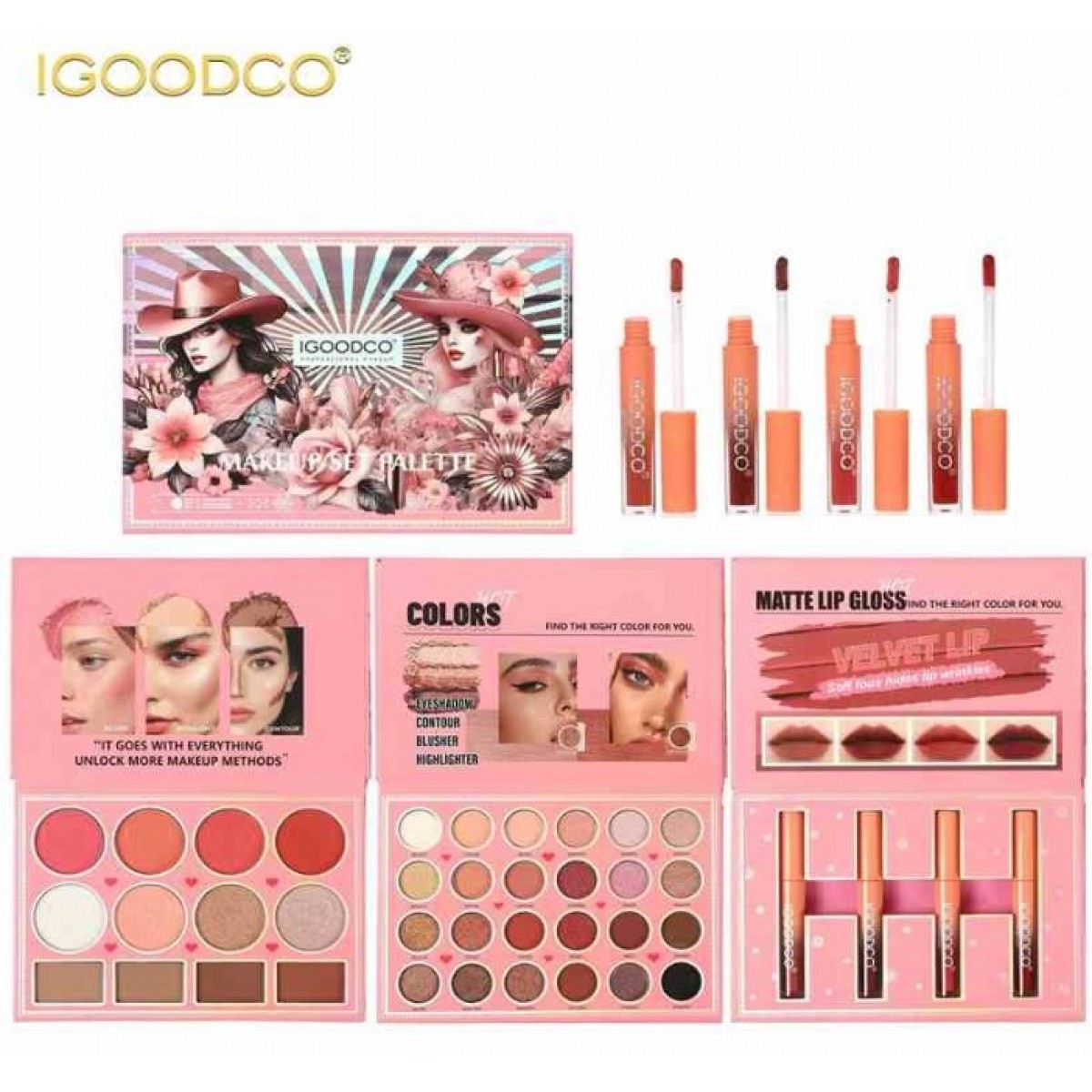Набір косметики IGOODCO Makeup Set — це великий подарунковий косметичний комплект у рожево-персиковій гамі, призначений для повноцінного макіяжу обличчя, очей і губ. У наборі представлена багатоколірна палетка тіней для повік із широким вибором нюдових, рожевих, коричневих і теплих відтінків з матовими та шиммерними текстурами. Також до комплекту входить палетка для обличчя з рум’янами, хайлайтерами та контурами у світлих і середніх тонах. Додатково набір містить матові блиски та помади для губ у рожевих, персикових і нюдових відтінках з оксамитовим фінішем. Набір поєднує універсальну комплектацію, гармонійну кольорову палітру та привабливий дизайн, що робить його зручним для щоденного використання та подарунку.