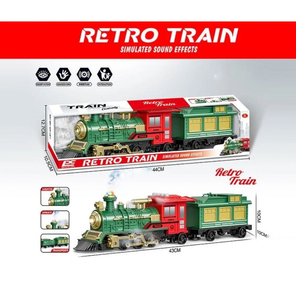Ретро-поезд с вагоном – стильная игрушка, подарящая ощущение увлекательного путешествия! Модель имеет инерционный механизм, реалистичную парогенерацию, подсветку и звуки поезда, которые включаются кнопками на крыше. Такое влечение станет украшением любой детской коллекции и подарит множество ярких моментов!