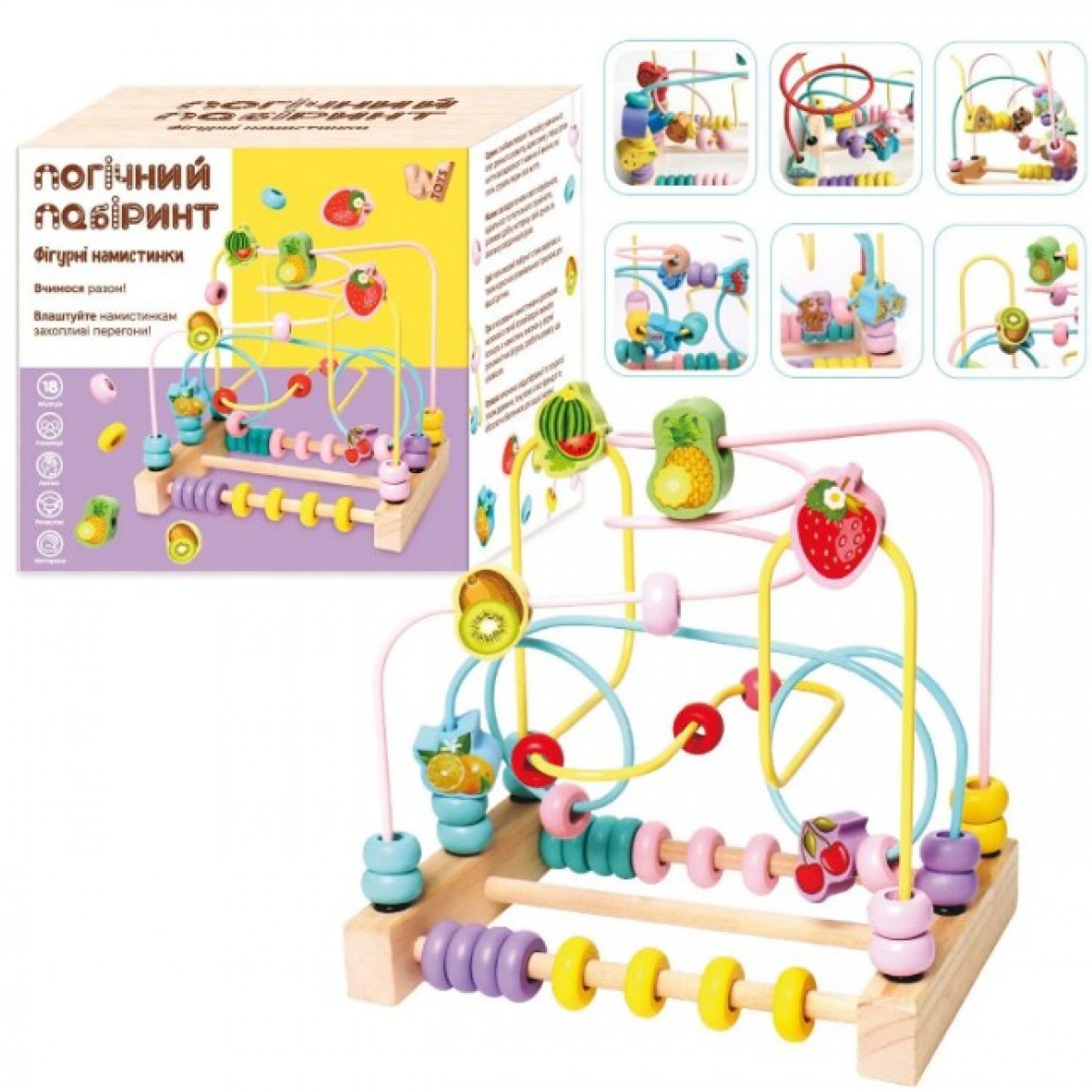 Игра с яркими бусинками поможет малышу в легкой игровой форме изучить цвета, а бусины, выполненные в форме разнообразных фигурок, сделают развлечение еще более интересным.