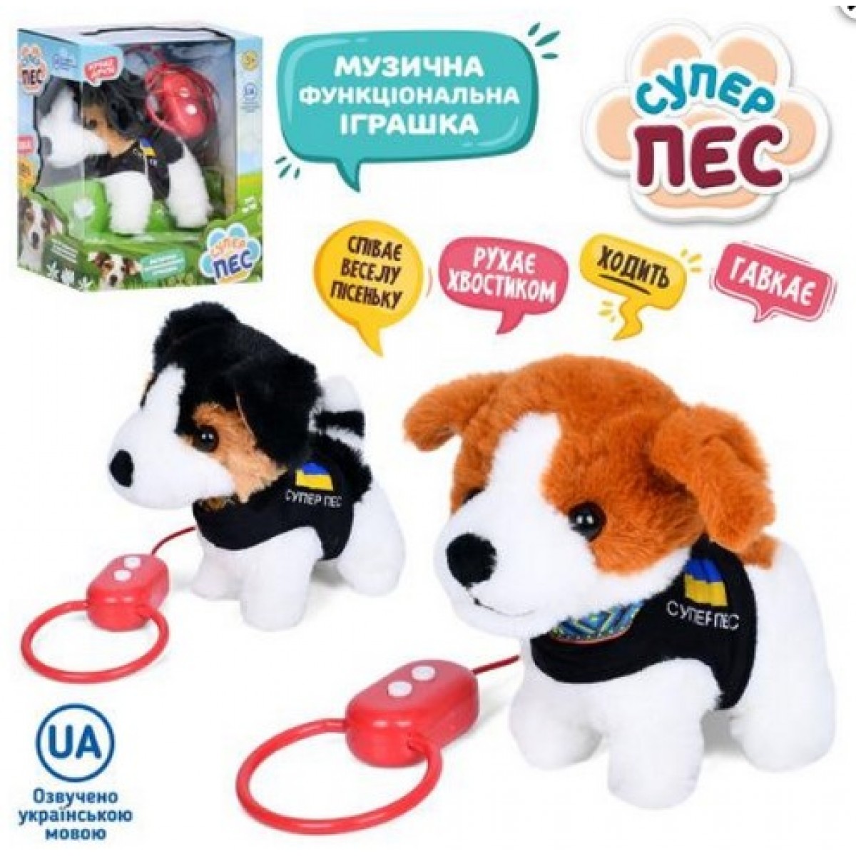 • Собака M 5834 I UA дист.управление.(поводок), ходит, движ.хвостом,плюш, муз.(укр.)-песня, в коробке