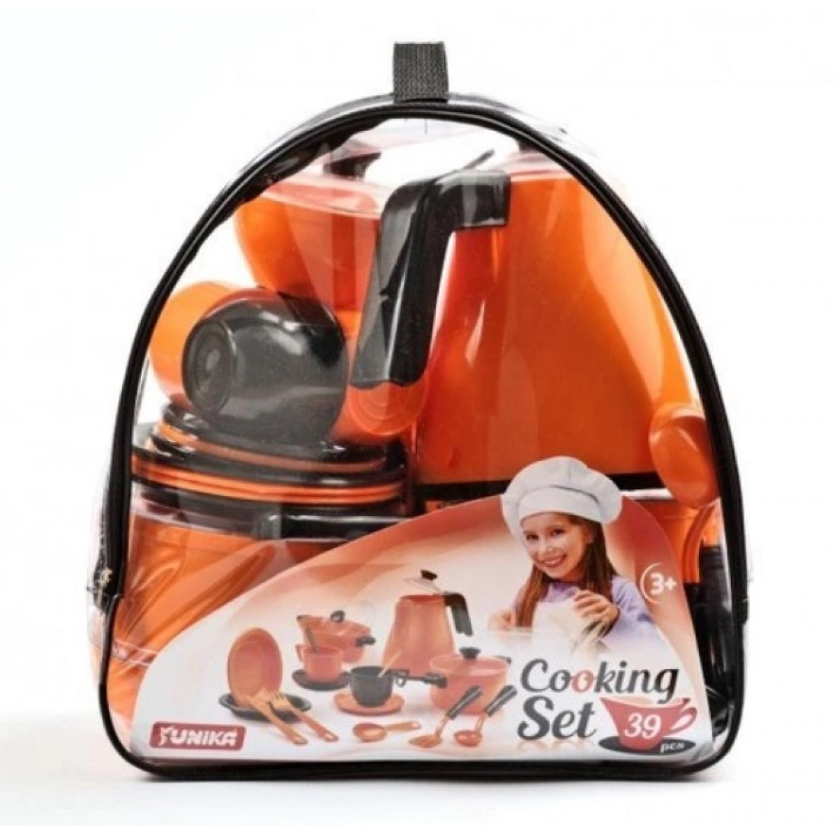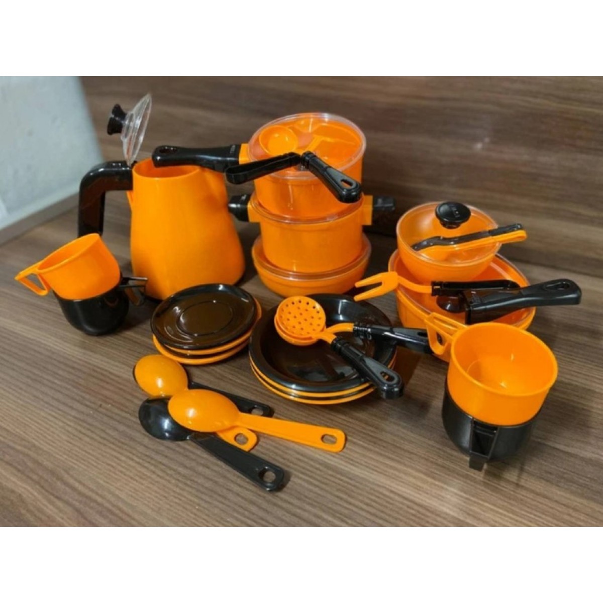 Кухонный набор будет интересным подарком ребенку. В наборе есть: чайник, 2 кастрюльки (большая и маленькая), сковорода, мисочка, 8 тарелочек (4 больших и 4 маленьких), кухонные приборы (по одному) и столовые приборы (по 4). Выполнен из качественного пластика.