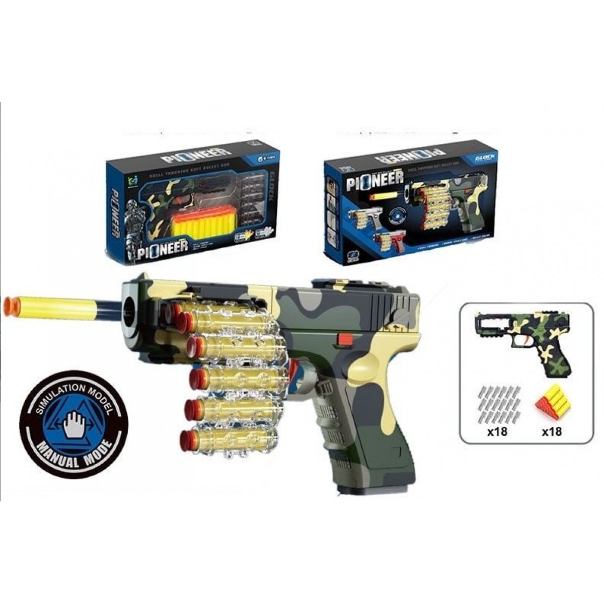 Игрушечный пистолет с тематической окраской - отличный способ мальчику научиться стрелять точно. Пистолет работает по механическому принципу, поэтому для начала стрельбы нужно передернуть затвор и нажать курок. Главная особенность модели – шаровая лента, которая вмещает сразу 18 патронов. Итак, заряжайте оружие, определяйте цель и начинайте тренировки на точность!