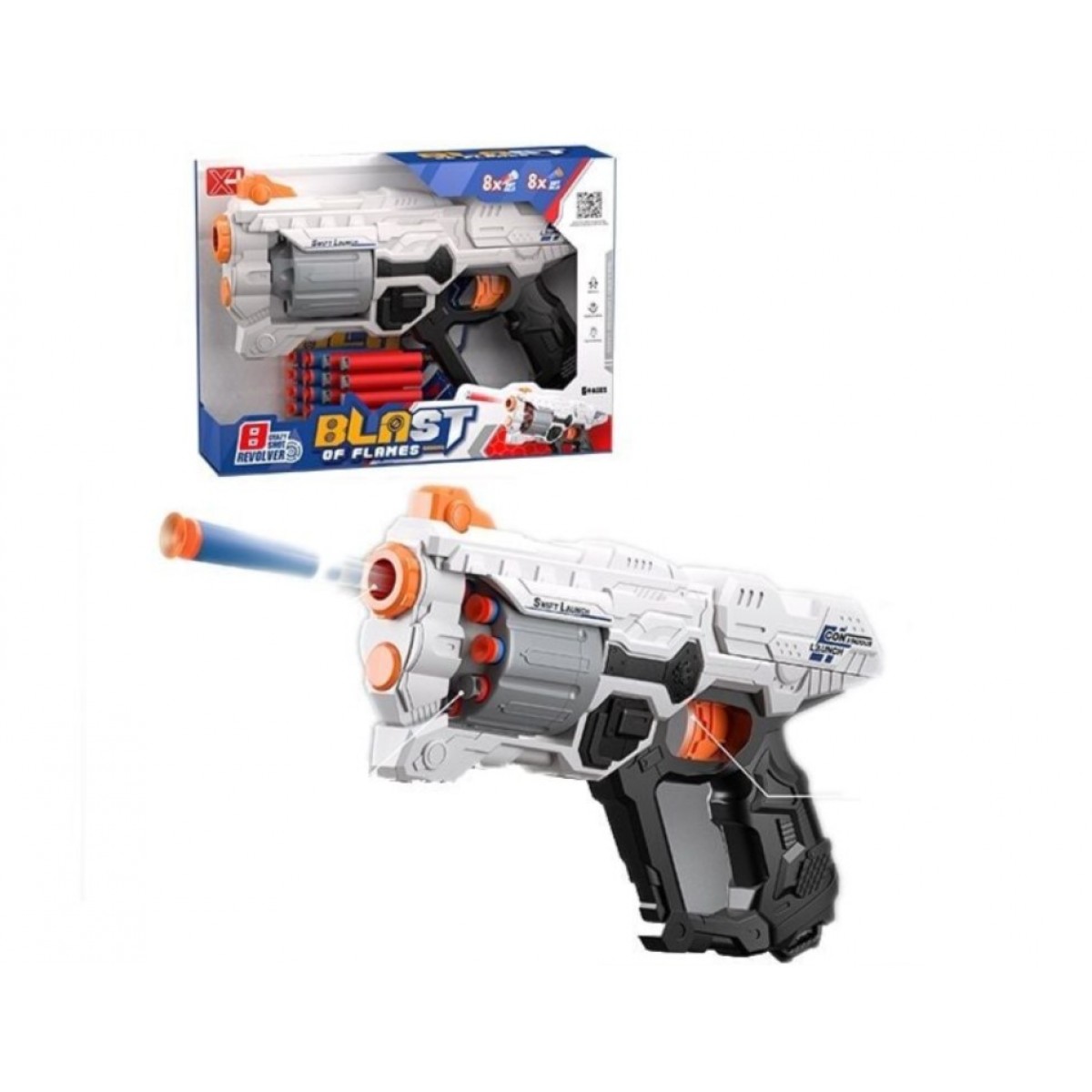Оружие победителя! Мощный пистолет с космическим дизайном станет сильным аргументом в сюжетных играх. У него яркий цвет, который сразу привлекает внимание, большой барабан, вмещающий сразу 8 патронов, и широкая морда. Пистолет работает по механическому принципу, поэтому для начала тренировки нужно зарядить его, потянуть затвор и нажать на спусковой крючок.
