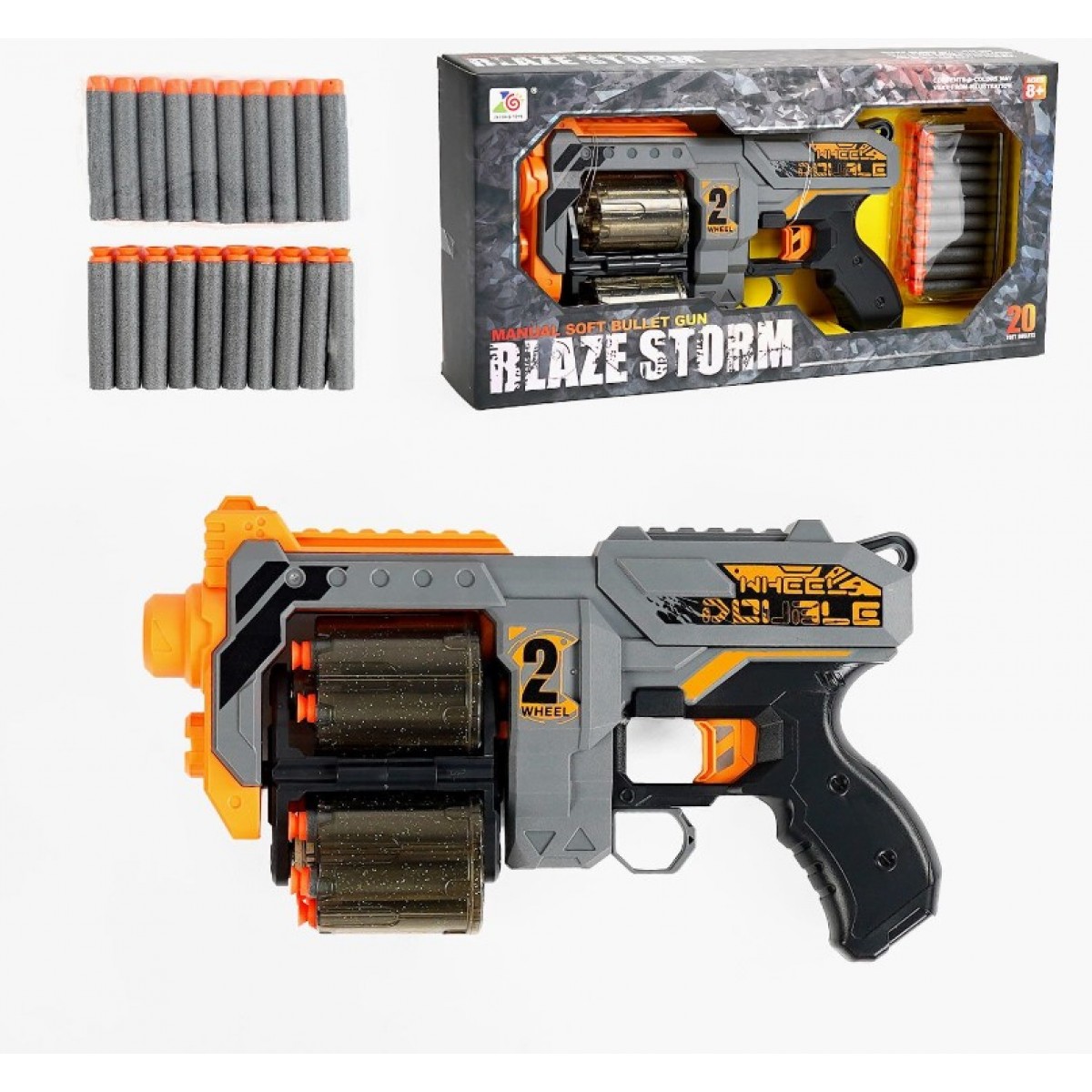 Этот яркий пистолет стреляет безопасными мягкими патронами и в комплекте с ним идет целых два вида: с присосками и без. Оружие имеет стильный, но одновременно функциональный дизайн и удобно ложится в руки. Игрушка изготовлена из прочного и легкого пластика, поэтому ребенку будет легко им манипулировать, чтобы выиграть в любом игровом противостоянии.