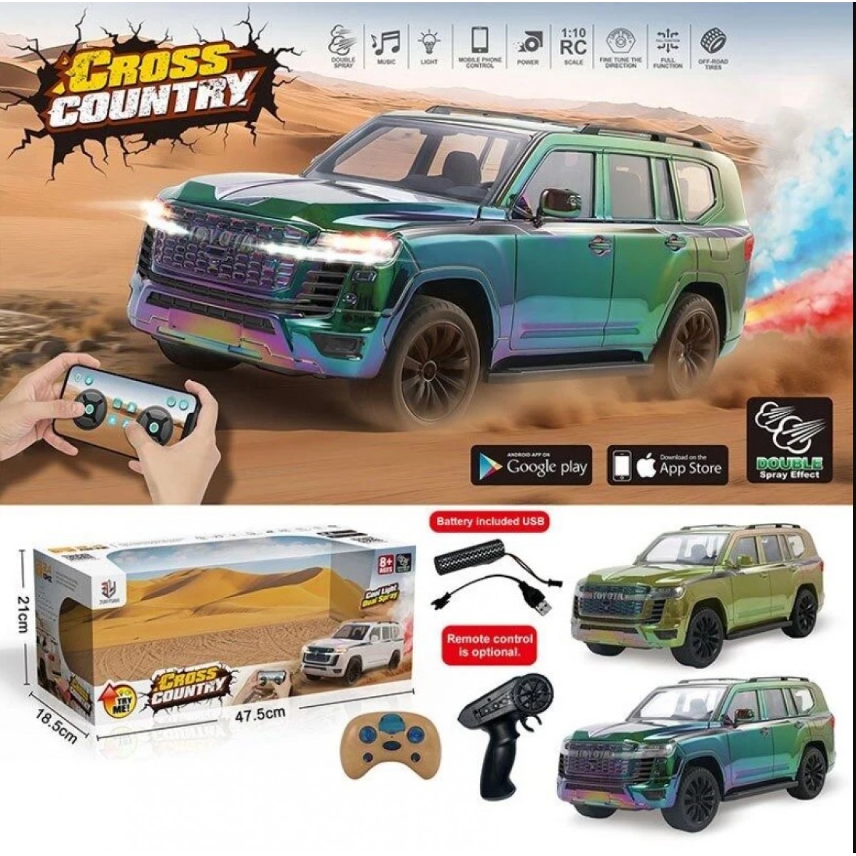 Готов покорять бездорожье? Этот мощный внедорожник в масштабе 1:10 создан для ярких заездов и зрелищных маневров. Машинка имеет парогенерацию, двигается по всем направлениям, воспроизводит звуки и динамическую музыку, а при необходимости можно включить беззвучный режим. Кроме этого, она имеет яркую подсветку, которая придает эффектности каждому заезду и делает игру еще более увлекательной в темное время суток.