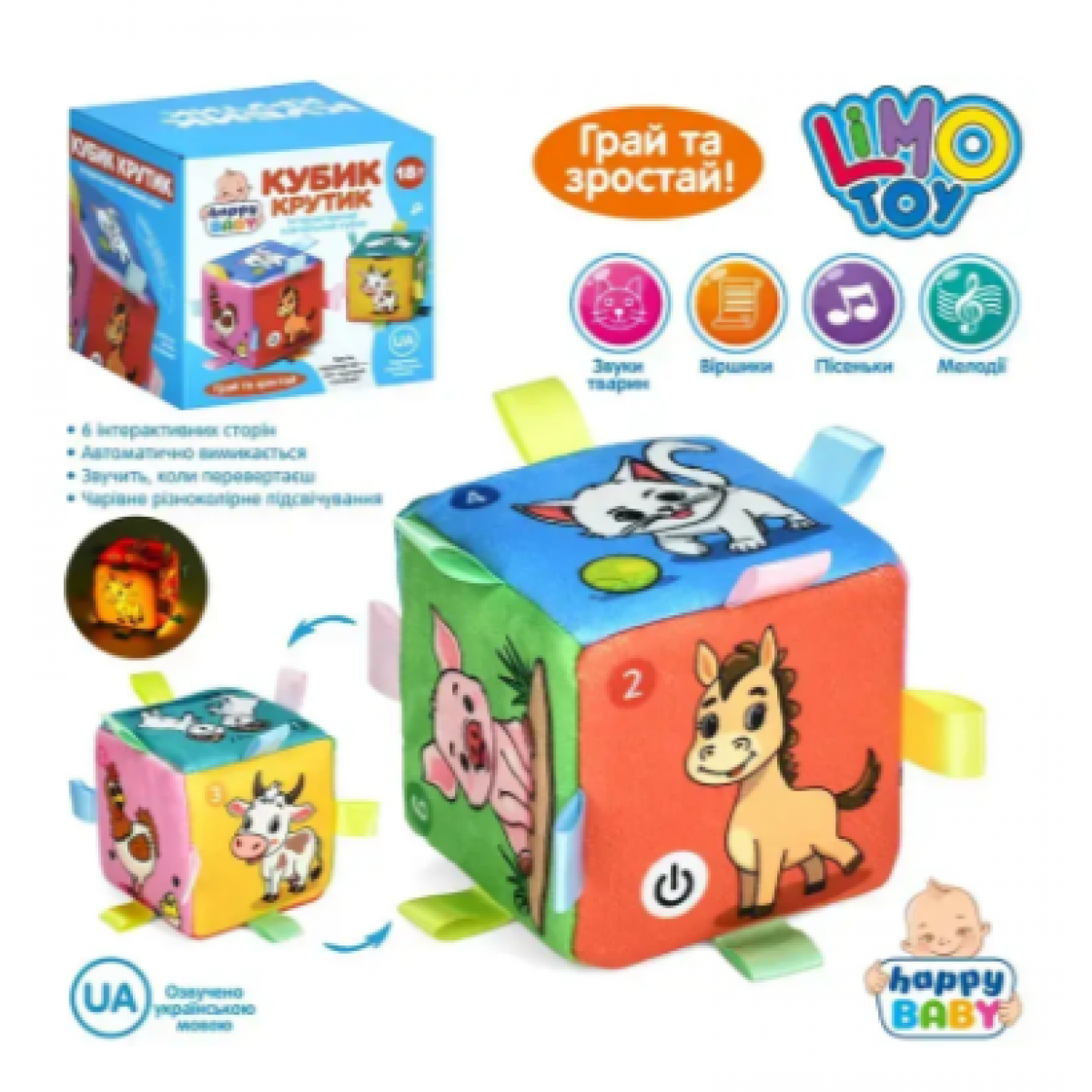 Кубик Limo Toy HB 0076 – яркая обучающая игрушка для малышей, сочетающая игру и развитие. Кубик-крутик размером 10 см изготовлен из сочетания мягкого плюша и прочного пластика, благодаря чему приятен на ощупь и безопасен для детей. На гранях расположены изображения животных и интерактивные кнопки. Игрушка озвучивает стихи и песни на украинском языке, воспроизводит звуки животных и мелодии, сопровождая игру световыми эффектами. Такое сочетание способствует развитию слухового и зрительного восприятия, памяти, речи и воображения. Кубик работает от батареек и поставляется в коробке размером 10,5×10,5×10,5 см.
