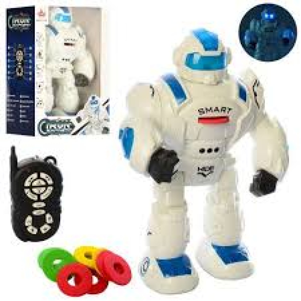 Робот управляется с пульта. Чтобы выстрелить ярким диском, сперва необходимо вставить её роботу в специальный разъем в области груди. Игрушка с интересным дизайном привлечёт внимание ребёнка и подарит ему много положительных эмоций. Игрушка вдохновит детей на новые сюжеты для игр. Компактные размеры позволяют не расставаться с игрушкой и брать её в путешествие.