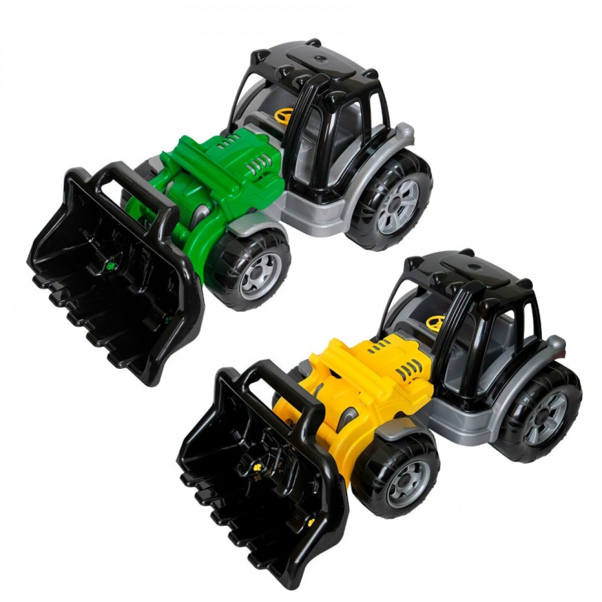 Модель выполнена в ярких цветах и оснащена массивным передним ковшом, позволяющим ребенку загружать и перемещать песок, землю или игрушки, имитируя работу настоящего погрузчика.