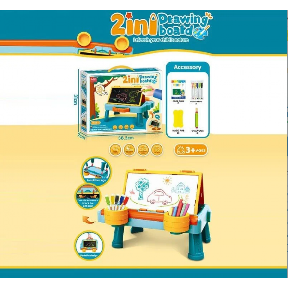 Эта доска для рисования станет любимым творческим пространством каждого ребенка! В комплект входят маркеры и цветной мел, так что малыш может сразу начинать создавать собственные шедевры. Доску можно установить на ножки как мини-столик или использовать как переносной чемоданчик для рисования где угодно. С обеих сторон есть удобные контейнеры для принадлежностей, которые помогают держать все под рукой. Такой набор развивает фантазию, мелкую моторику и творческие навыки, даря много веселых моментов.