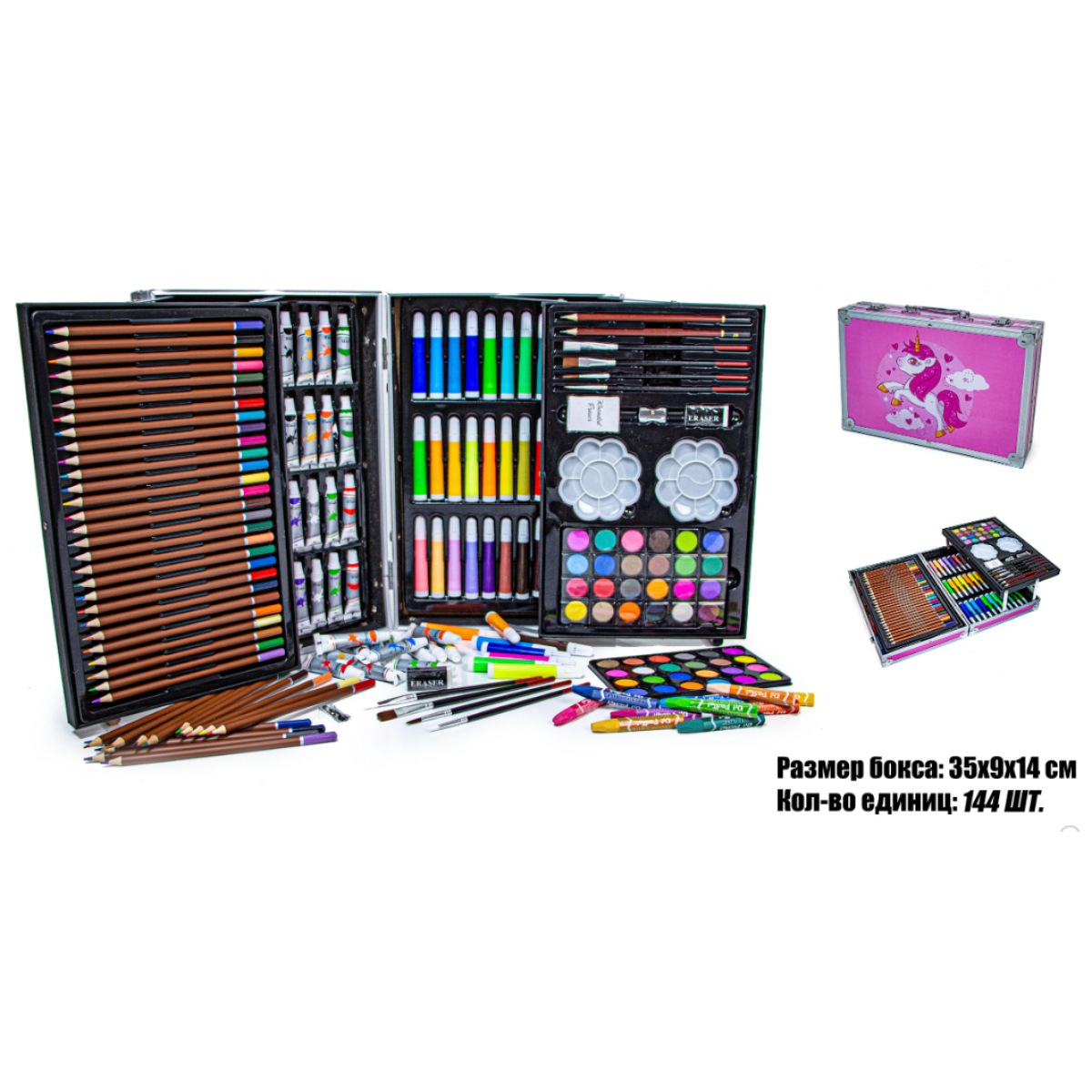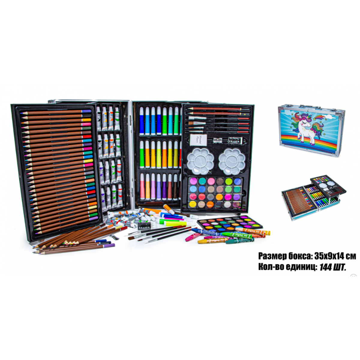 Большой набор для рисования для детей старше 3 лет. Он состоит из 144 элементов, помещенных в красочный эстетичный алюминевый сундучек, благодаря которому уменьшается риск потери карандашей, и в то же время он значительно облегчает транспортировку и использование набора ребенком, и не боится ударов и падения, что обеспечит долговечность. Благодаря сундучку у каждого элемента есть свое место..