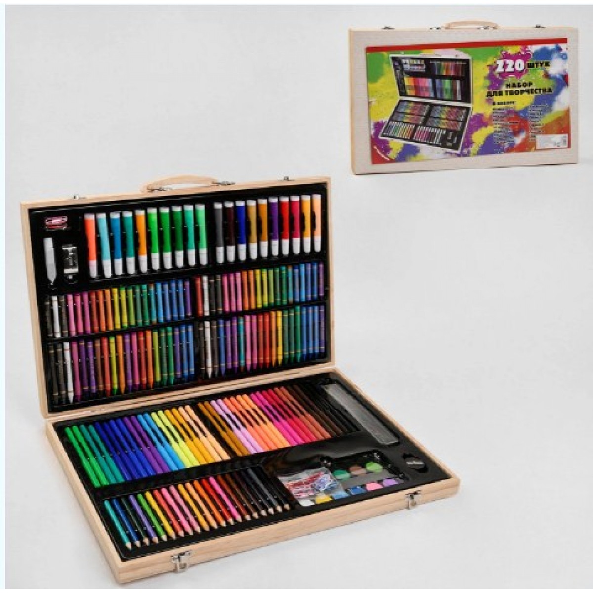 Набор для рисования в деревянном чемоданчике, 220 предметов, С49394, для детей от 3 лет, Пакунок малюка